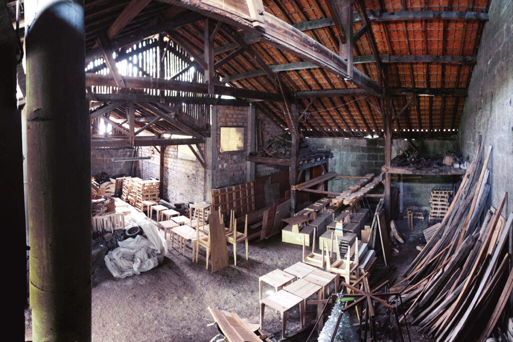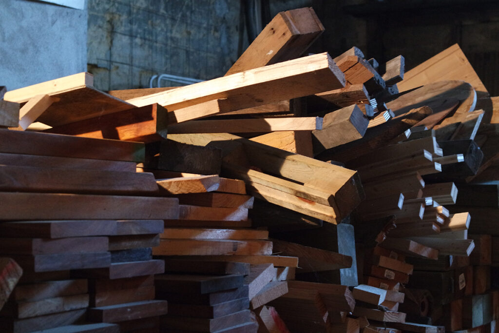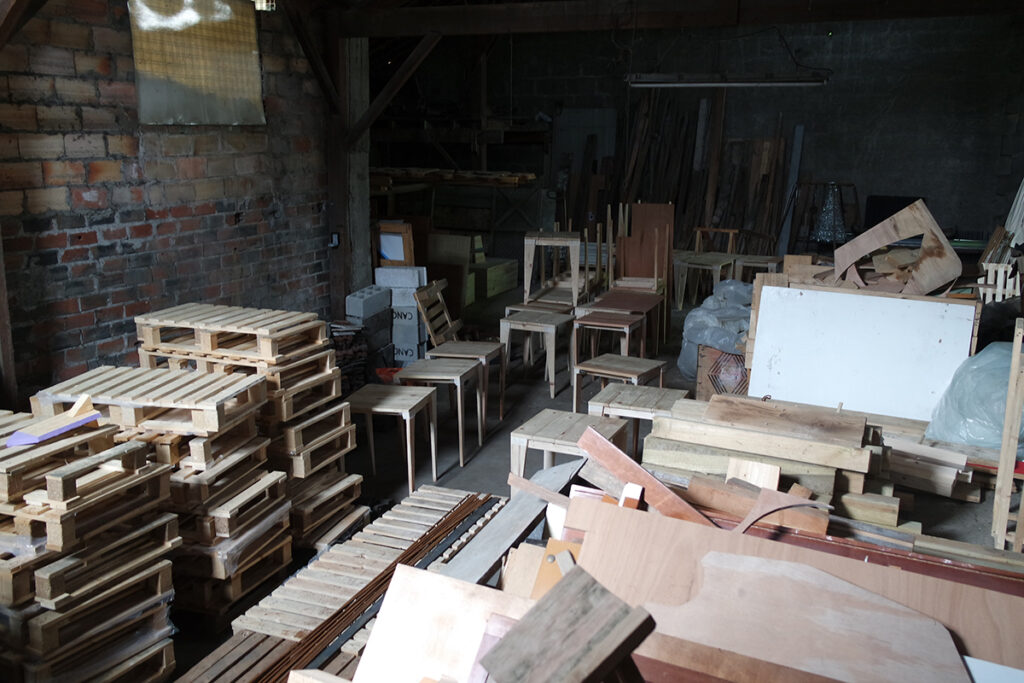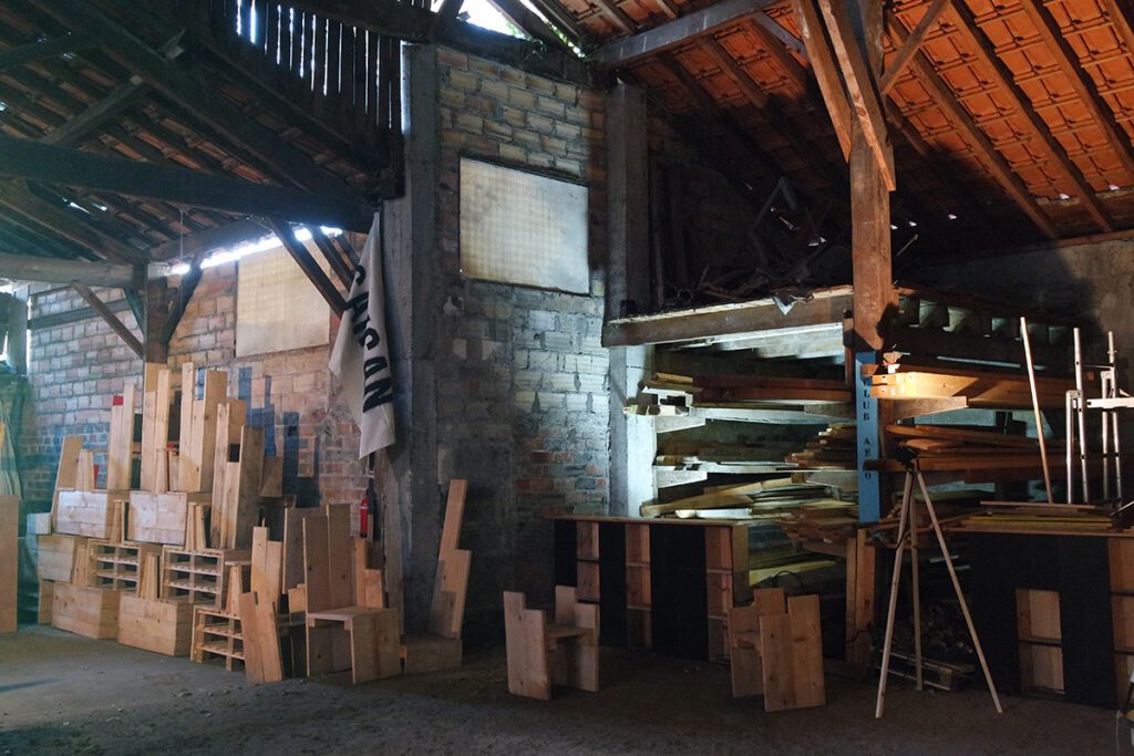 La halle attenante à l’atelier permet la répartition des éléments sur des racks (de réemploi également) afin de pouvoir piocher dedans au gré des projets.