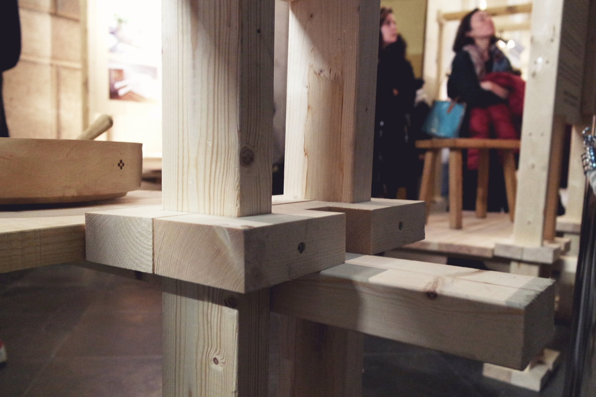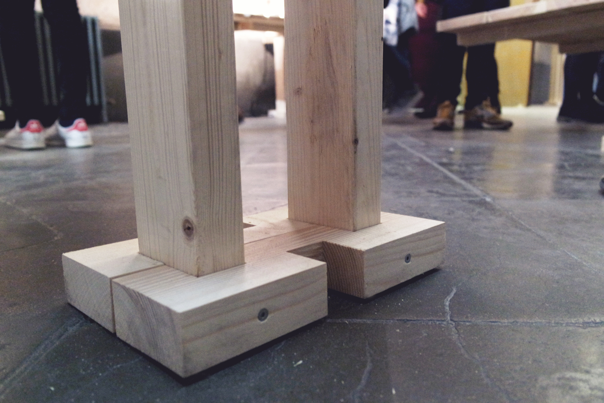 Le Bureau Baroque a mis du bois de « passage » à disposition pour réaliser l’intégralité de la scénographie. Ce bois de réemploi fut prêté pour l’exposition et a du être rendu en l’état pour être de nouveau réemployé. Cette exigence a été notre règle du jeu : pas de découpes ou d’usinages dans les montants et panneaux de bois. Ainsi, une répartition minutieuse des éléments a été réalisé suivant leurs dimensions. Et des pièces d’assemblages ont été inventé afin de pouvoir créer les structures nécessaires à l’exposition.