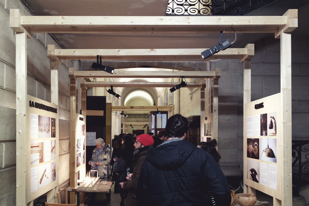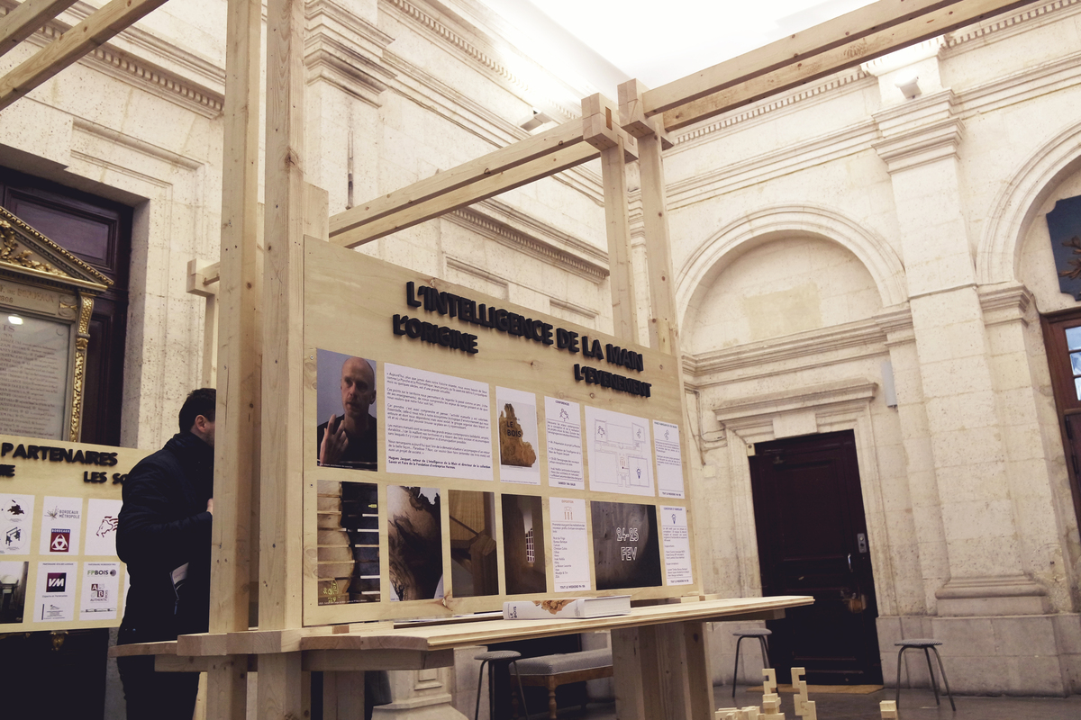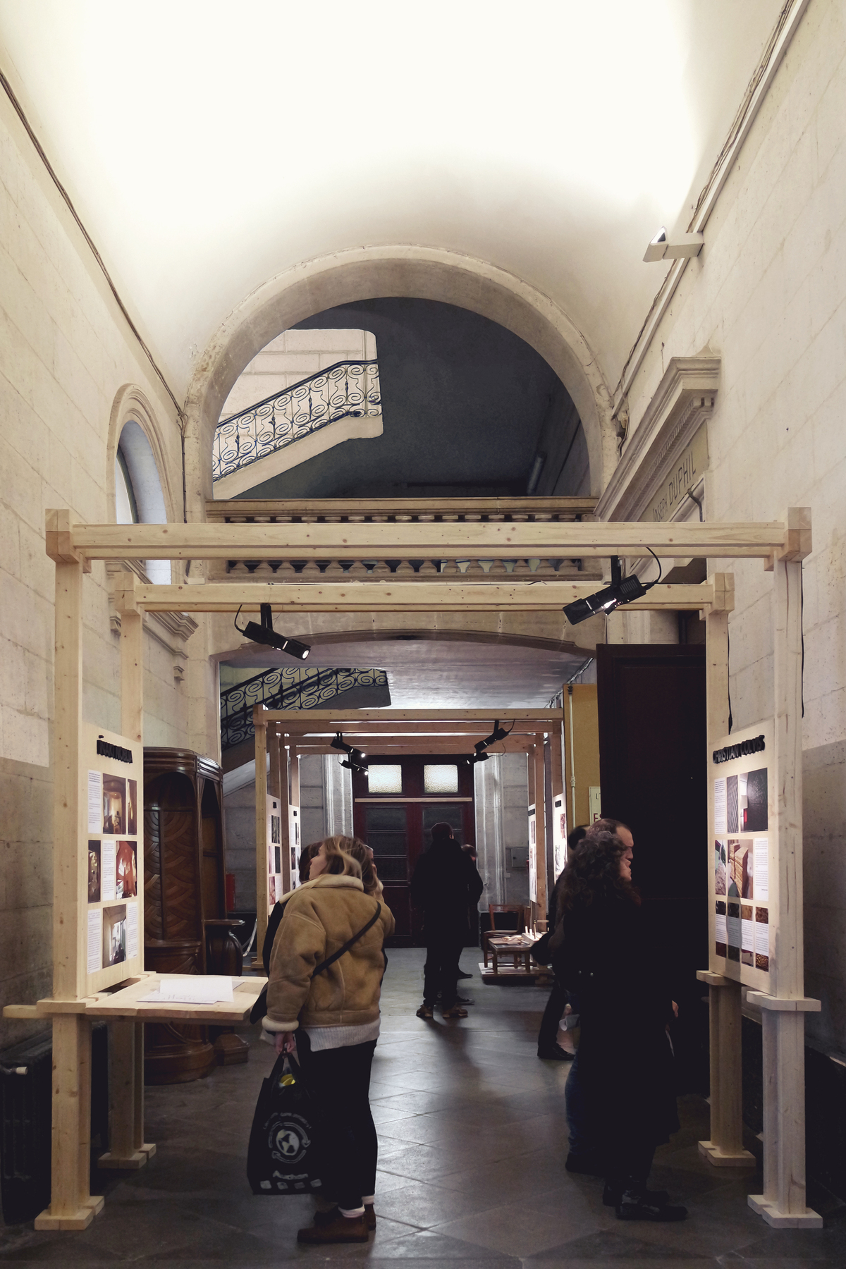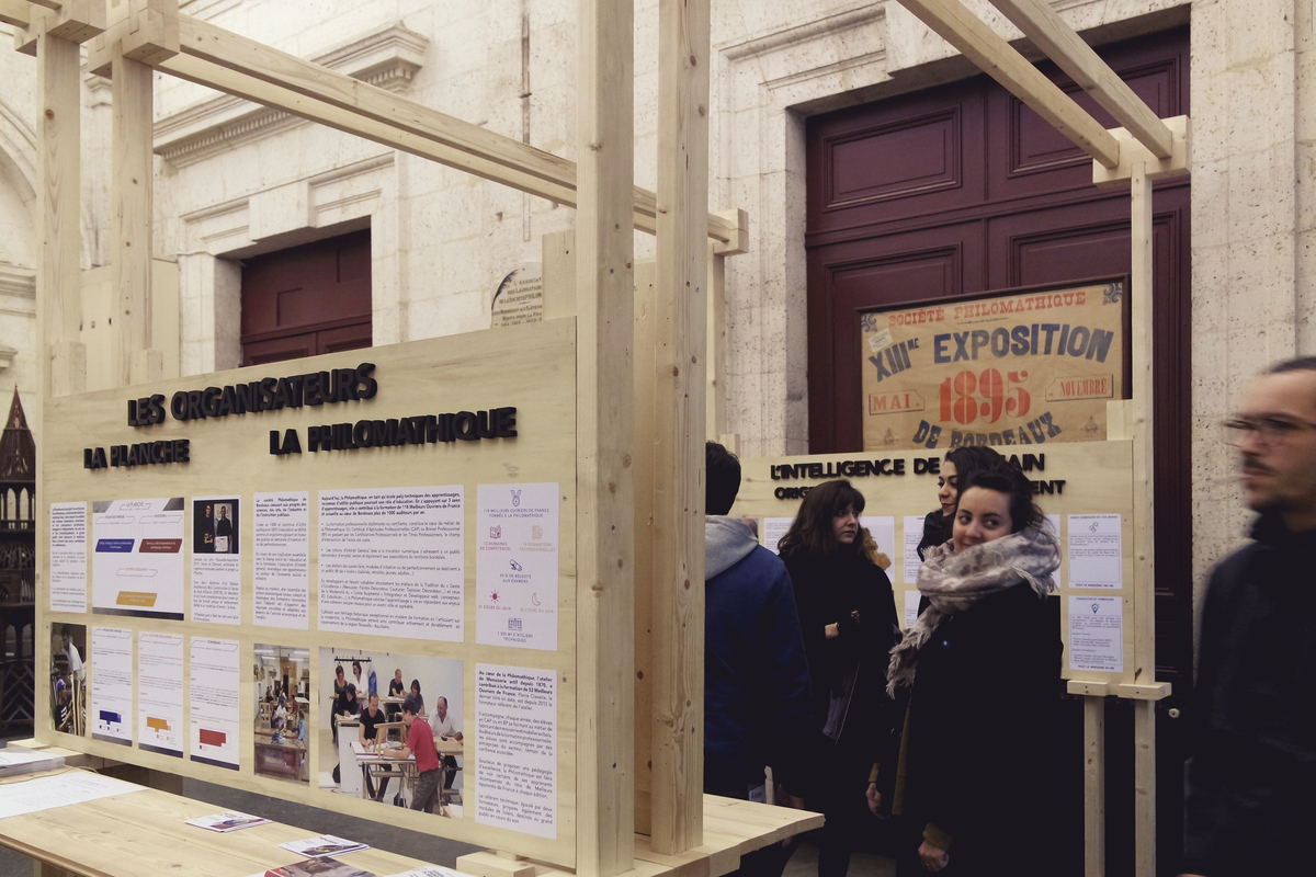 Le hall et les circulations de la Philomathique ciblés comme espaces d’exposition sont imposants, chargés d’histoire et faits de pierre. Afin de focaliser l’attention des visiteurs sur la production et la parole des exposants, nous avons conçu des portiques en bois permettant l’affichage et l’exposition d’objets. A la fois légers et massifs, passant d’espaces lumineux et sombres, d’un assemblage simple et complexe, ces portiques re-situent le visiteur dans une échelle plus intimiste, tout en dirigeant son parcours.