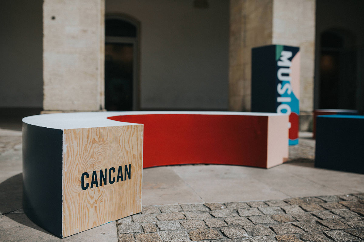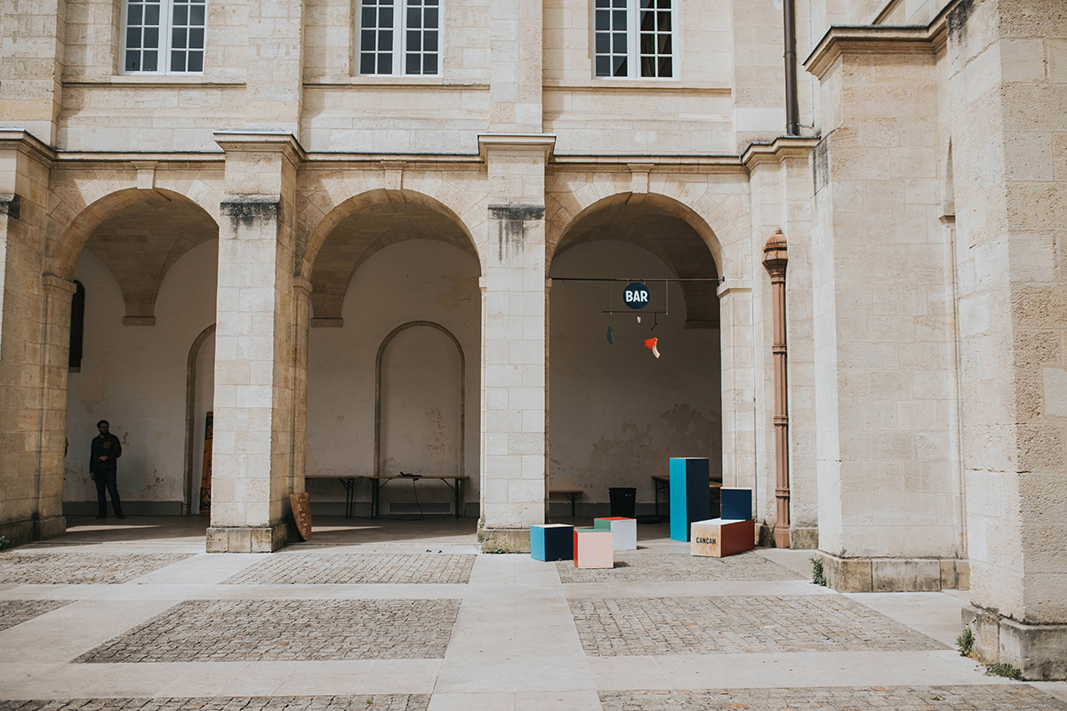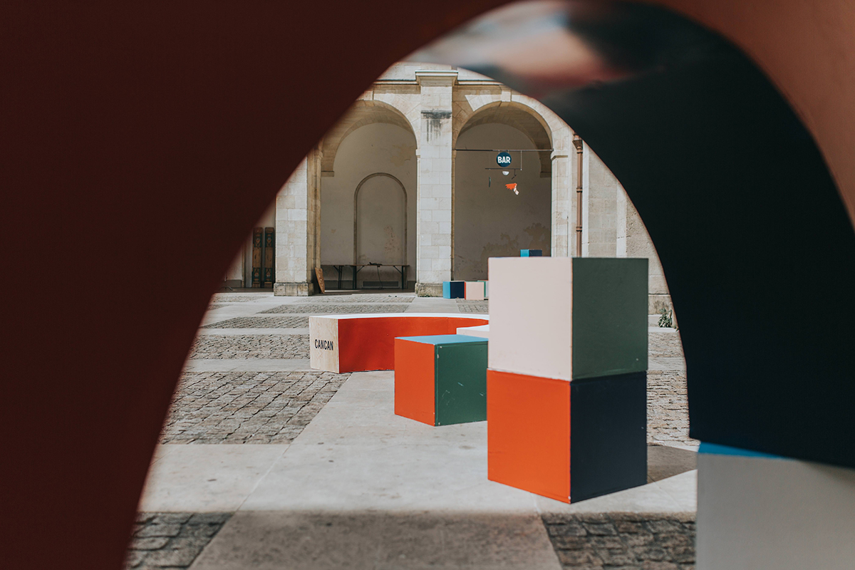 La scénographie proposée se base en effet sur l’identité visuelle de l’évènement aux couleurs et formes arrondies qui se retrouvent dans l’ensemble de la proposition et répondent aux trois points attendus au cahier des charges : signalétique, mobilier, éclairage. Les volumes alors imaginés, qui constituent assises & mange-debouts, rappellent également les formes architecturales du lieu et instaurent un dialogue avec celui-ci. Le concept du projet repose sur le jeu de contraste entre le caractère patrimonial du site et une installation modeste et colorée. Le mobilier prend la forme d’arches déconstruites : les colonnes et l’arcade sont découpés en modules (cubes, bancs droits, bancs en arc) qui peuvent être déplacés et agencés selon le goût de l’utilisateur. Ces modules sont conçus en bois contreplaqué déclassé brut ou peint dans les teintes de l’évènement.