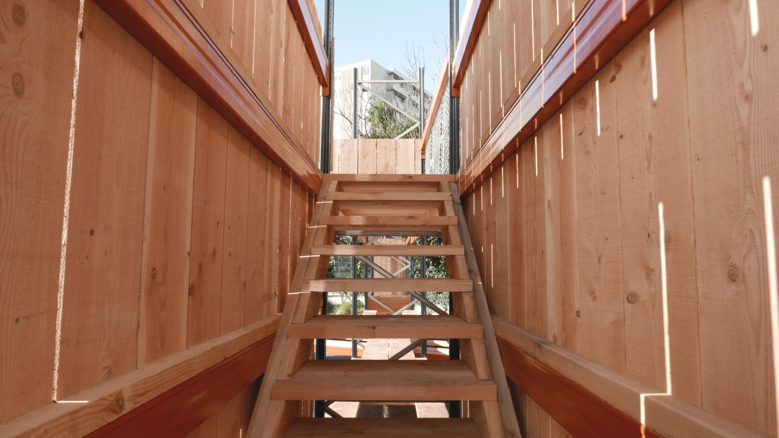 | MATÉRIAUX | Chevrons douglas, contreplaqué, voliges et palettes réemployées, fers à béton, gravats des chantiers proches |