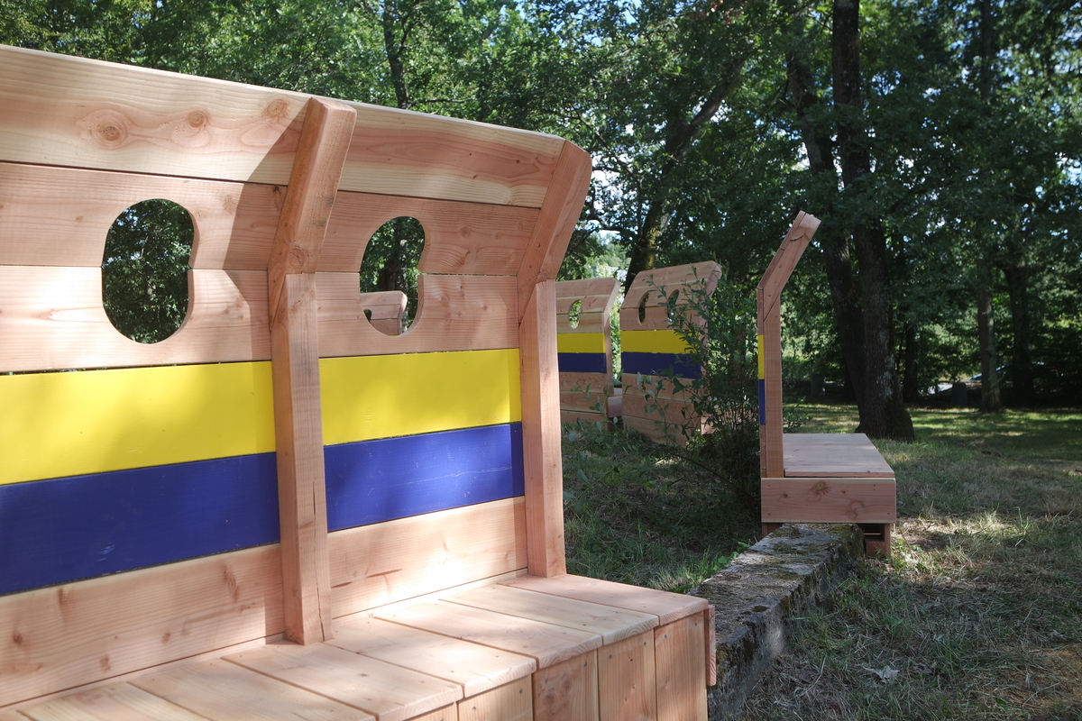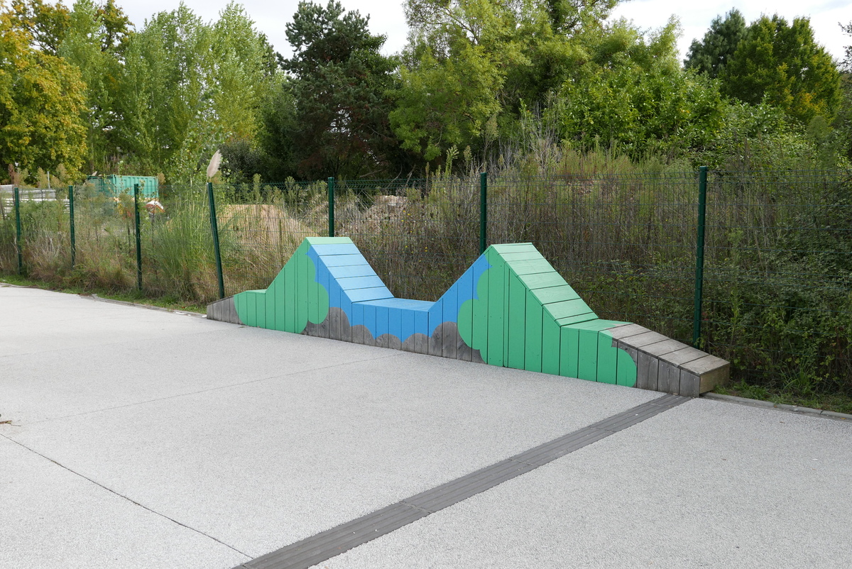Ils deviennent selon les envies de simples bancs et tables pour pique-niquer, des transats pour lire et prendre le soleil, des pans inclinés pour se laisser glisser et faire du sport… Le tout dans un univers graphique coloré et ludique.