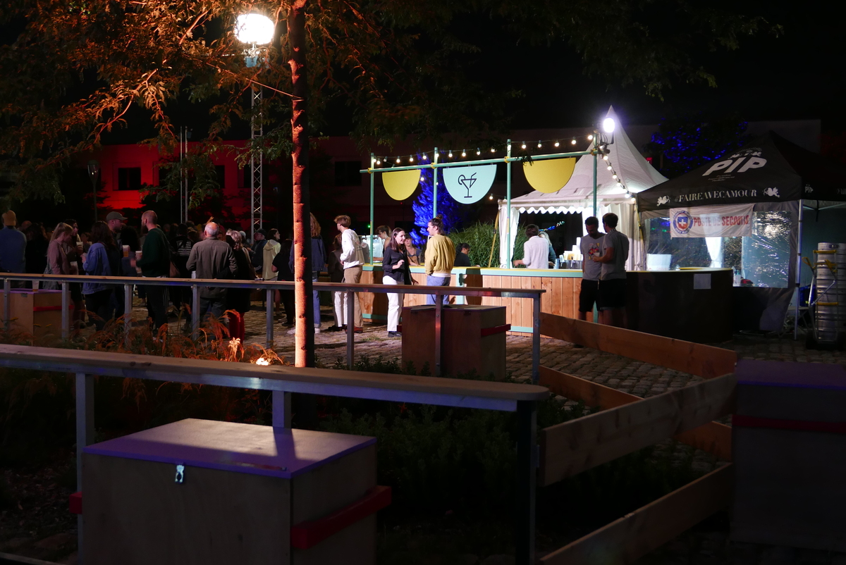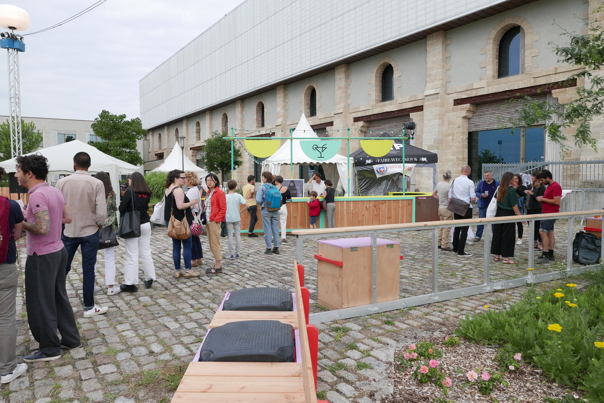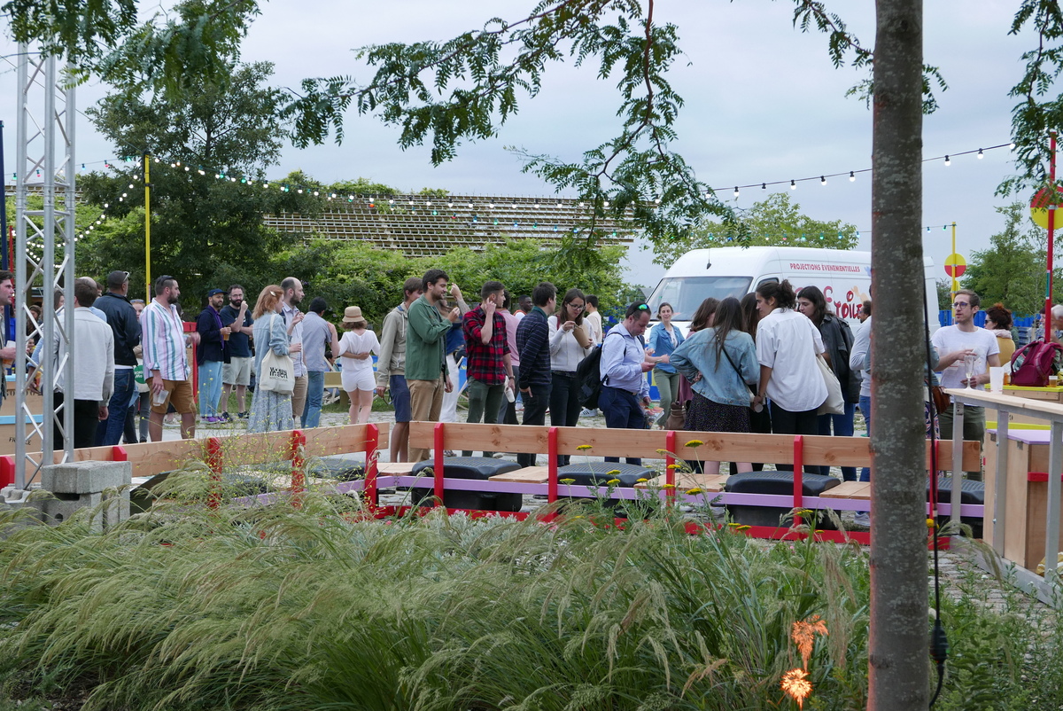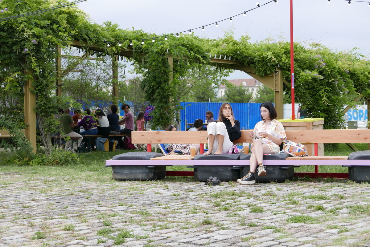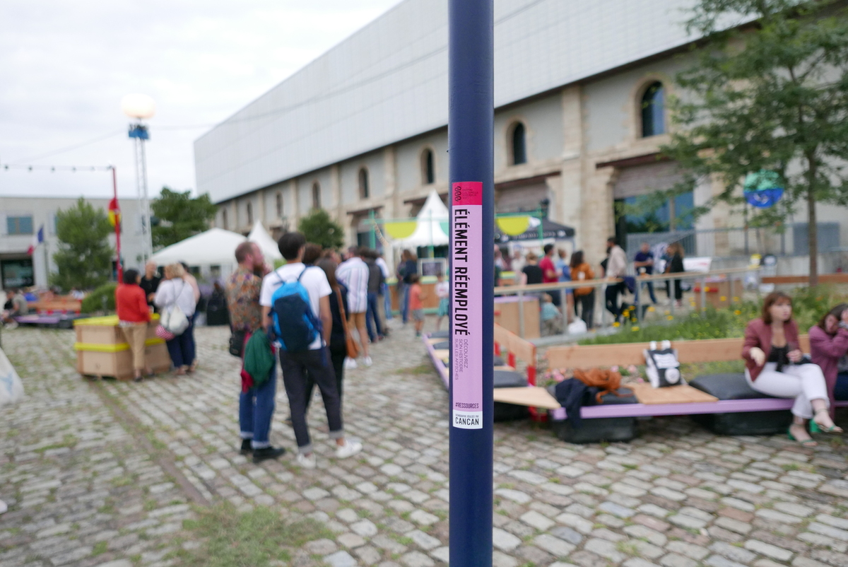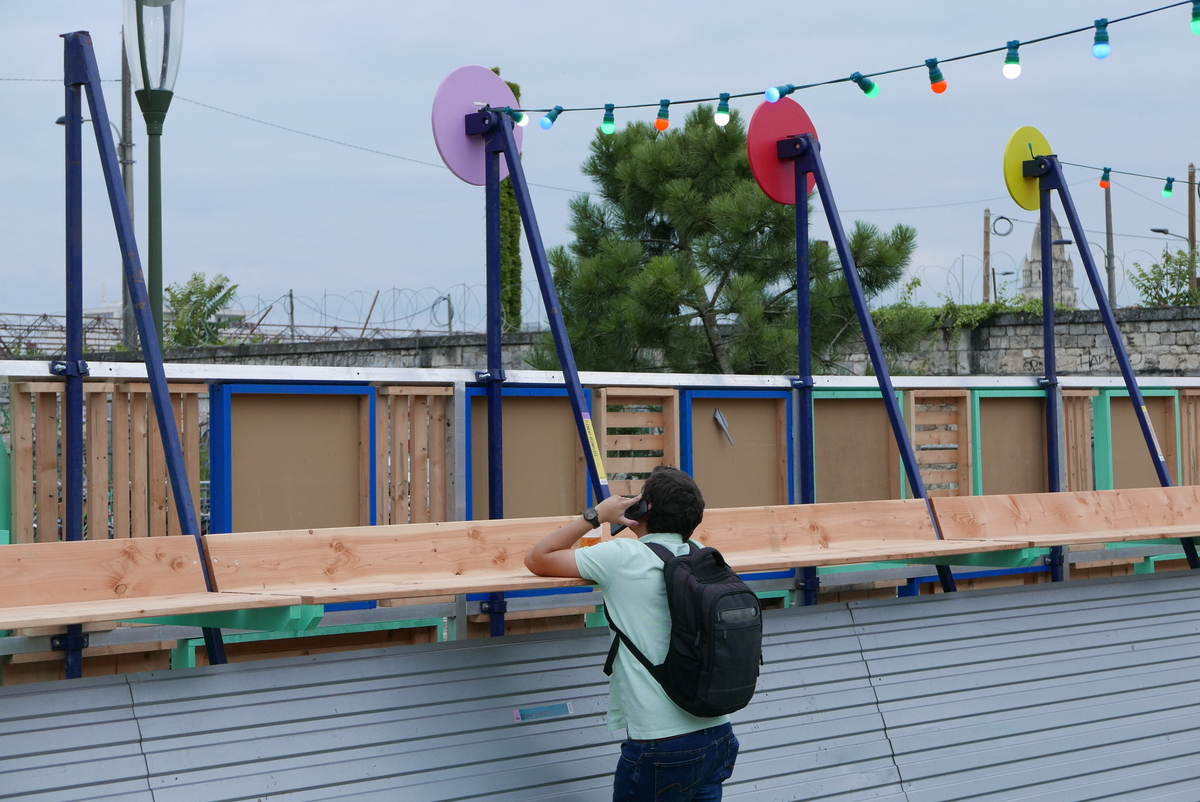 Avec Lucie Schneider, paysagiste et Jérémy Maréchal, menuisier autodidacte, CANCAN a imaginé et installé un aménagement extérieur formant des tables, mange-debout, hamac, assises, terrasses, gradins, etc.
