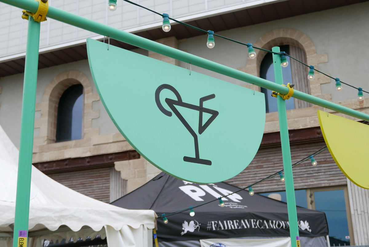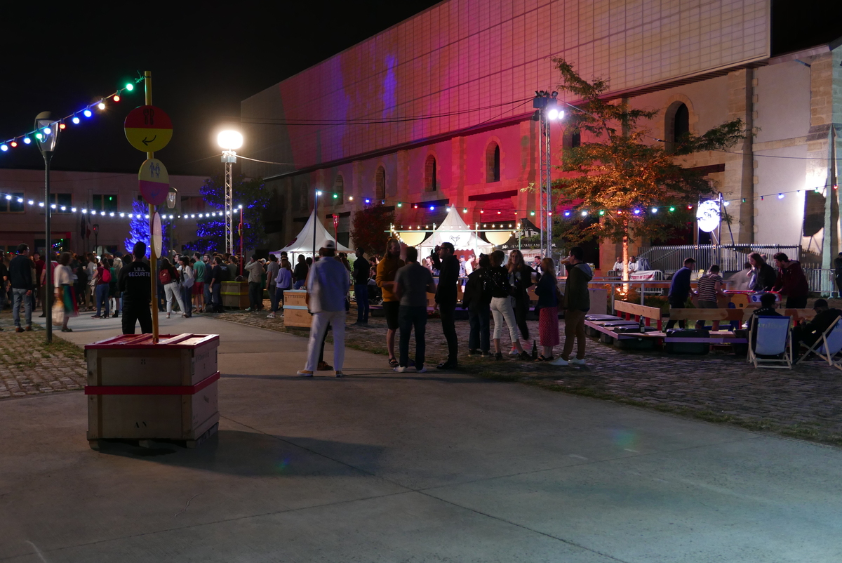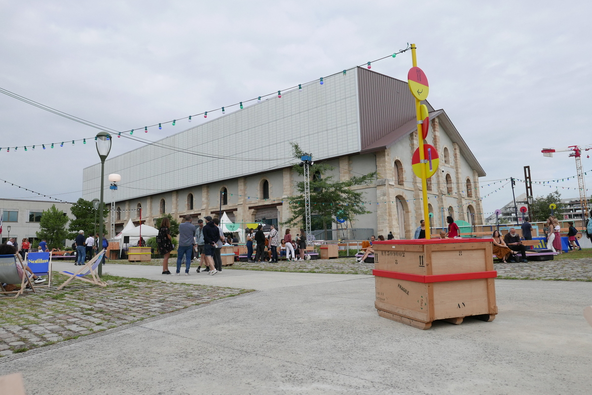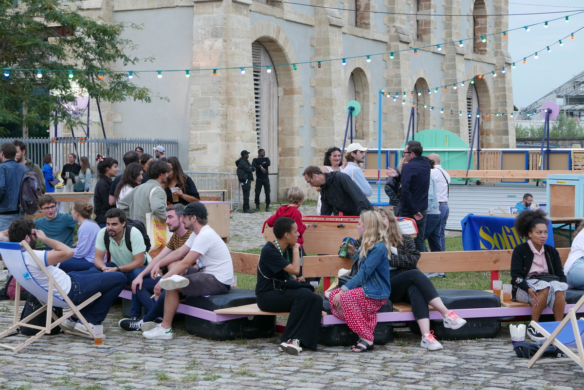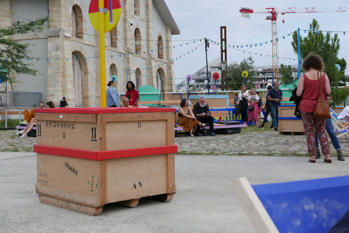 L’idée a été d’imaginer une scénographie en poussant au maximum le curseur du réemploi. En collaboration avec les équipes de la Mairie et de la Base Sous-Marine de Bordeaux, nous avons pu occuper pendant quelques semaines la Base Sous-Marine afin de sourcer des matériaux à réemployer pour ensuite fabriquer les éléments scénographiques dans le cadre d’un chantier ouvert. Les alcôves de la Base se sont avérées être de véritables mines d’or, certains éléments proviennent par ailleurs d’anciens décors déclassés de l’Opéra de Bordeaux. Ces éléments deviennent ici, dans leur seconde vie, un bar, des assises confortables, des mange-debout, des mats d’éclairage et de signalétique… Une troisième vie les attend sans doute pour un autre projet… Affaire à suivre !