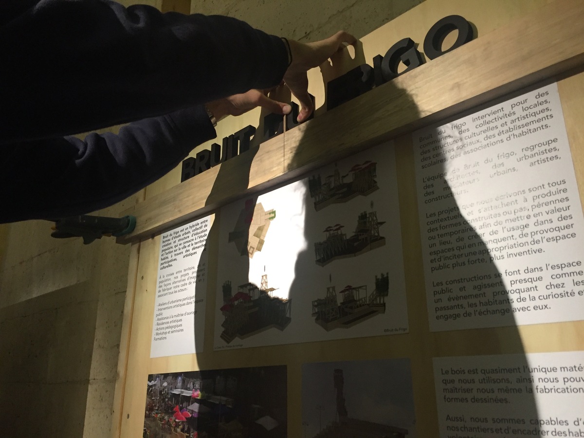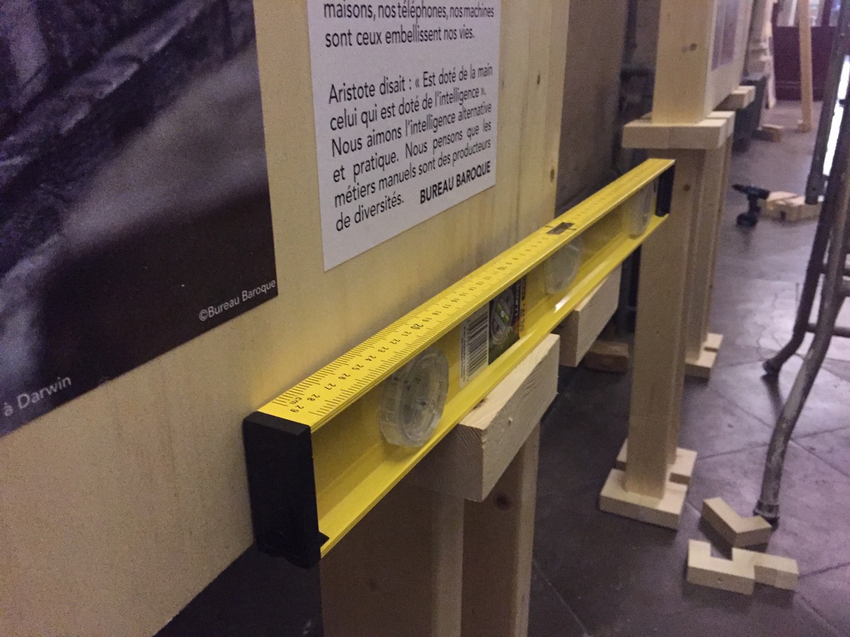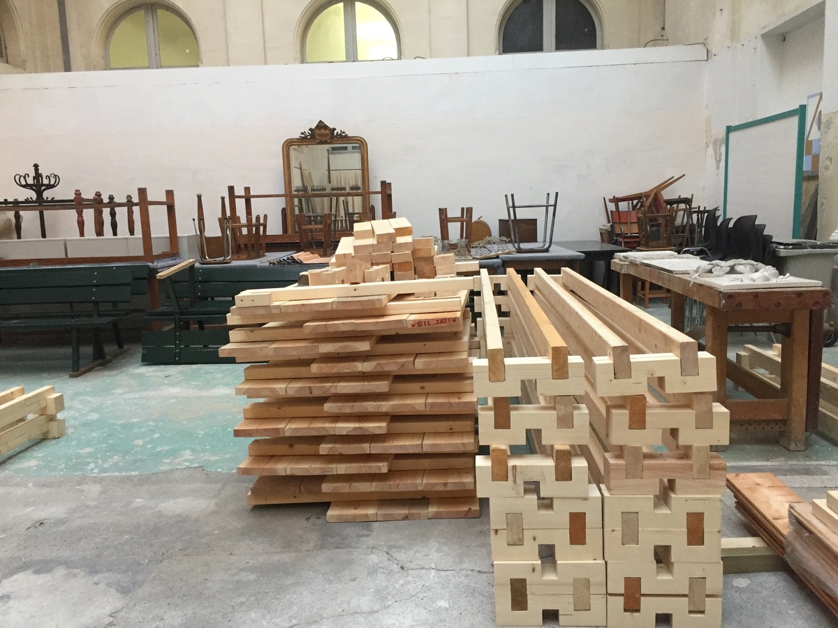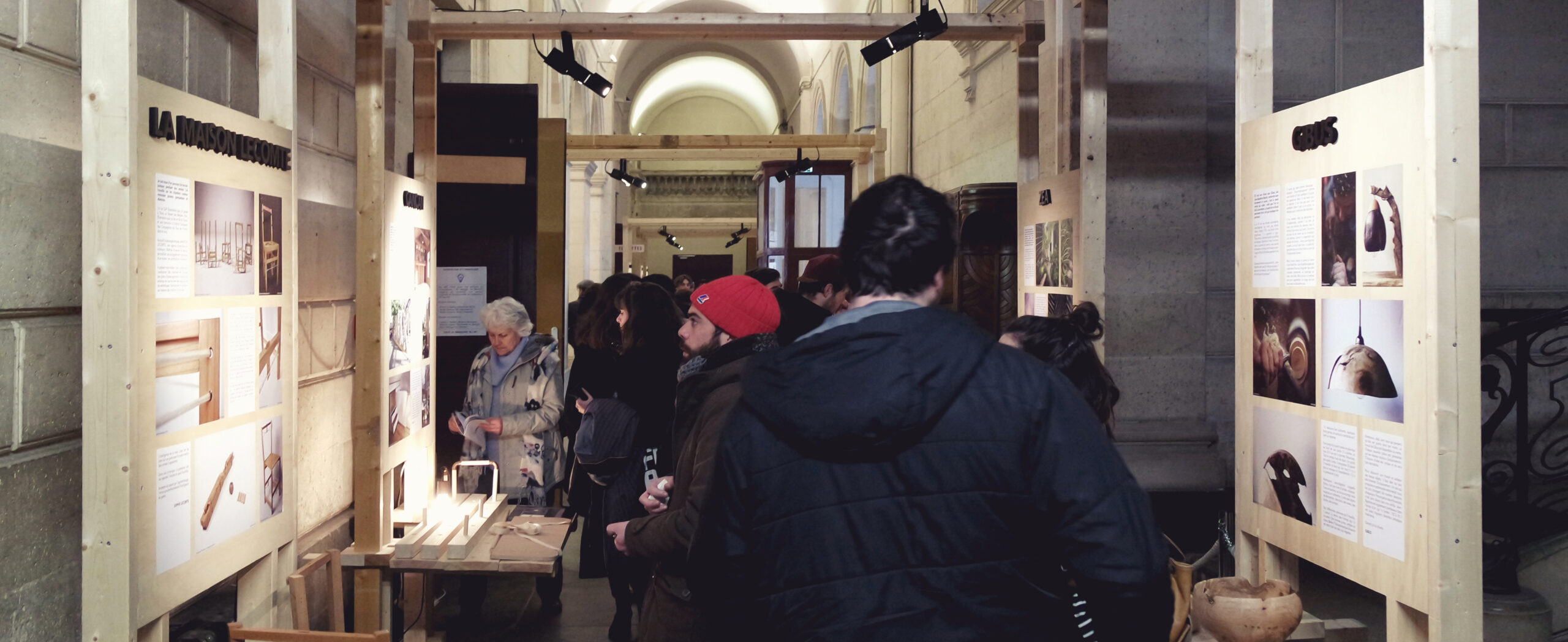 Pour cette scénographie, ce sont plus de 260 pièces de bois transportées et prêtées par Le bureau baroque. Mais aussi 288 pièces d’assemblages créées dans les ateliers de La Philomathique grâce à plusieurs dons d’entreprises de la filière bois. Un planning a été anticipé avec des temps forts identifiés : le transport, l’usinage, le montage, et le démontage. Sans oublier de coller, maroufler, et balayer. Et trinquer. Ce fut des temps de rencontres avec des entreprises locales de la filière bois, les différents exposants, et avec Hugues Jacquet socio-historien à travers un montage vidéo de leur rencontre avec La Planche.