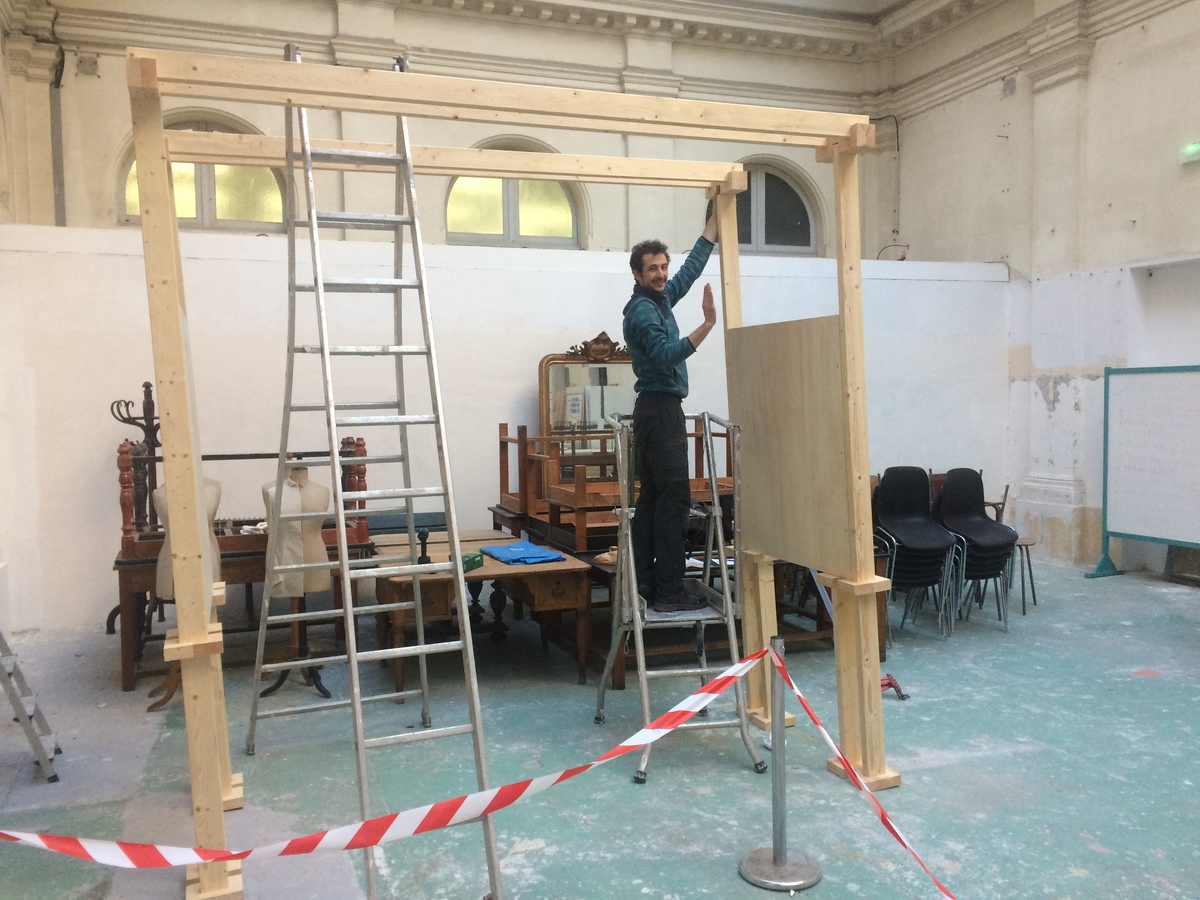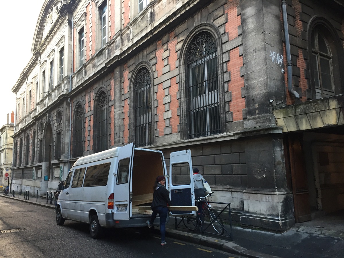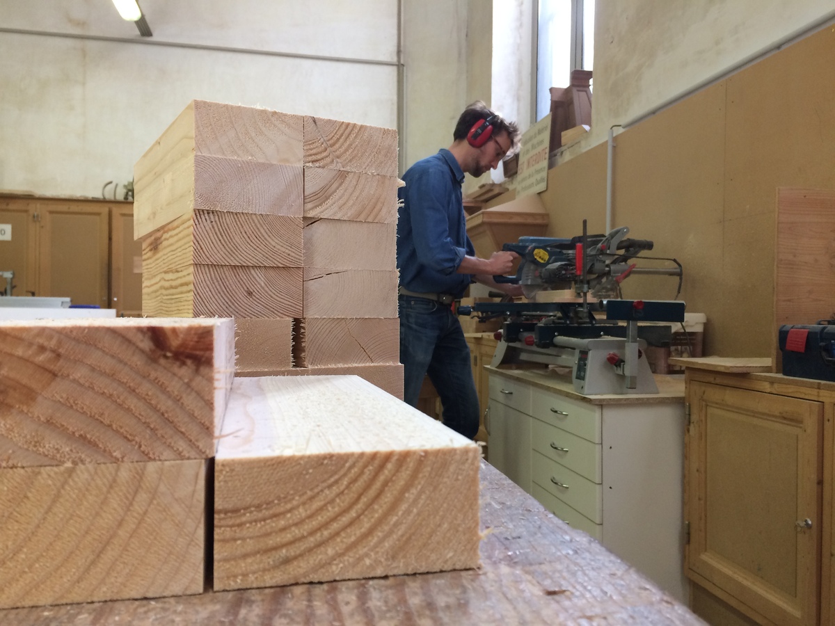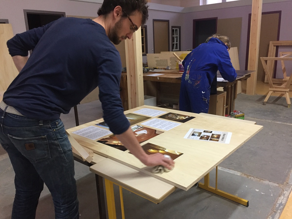 Pour cette scénographie, ce sont plus de 260 pièces de bois transportées et prêtées par Le bureau baroque. Mais aussi 288 pièces d’assemblages créées dans les ateliers de La Philomathique grâce à plusieurs dons d’entreprises de la filière bois. Un planning a été anticipé avec des temps forts identifiés : le transport, l’usinage, le montage, et le démontage. Sans oublier de coller, maroufler, et balayer. Et trinquer. Ce fut des temps de rencontres avec des entreprises locales de la filière bois, les différents exposants, et avec Hugues Jacquet socio-historien à travers un montage vidéo de leur rencontre avec La Planche.