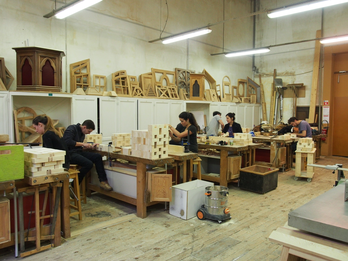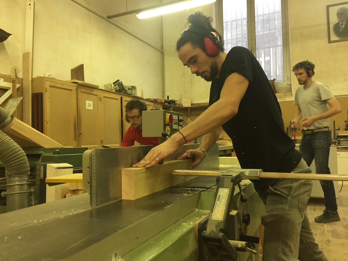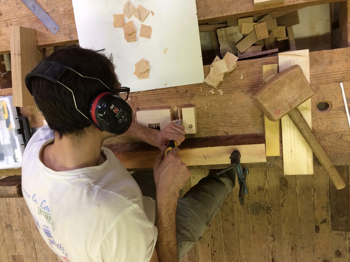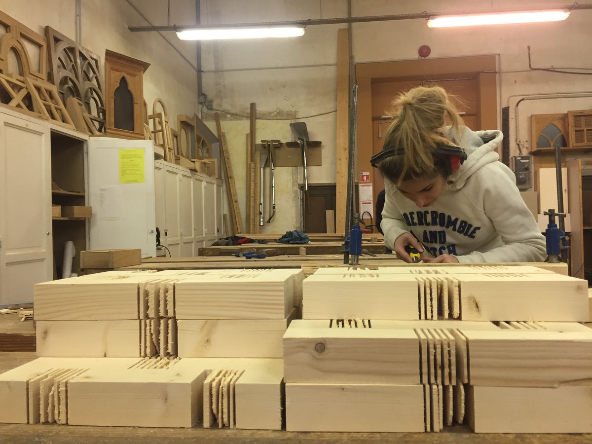Pour cette scénographie, ce sont plus de 260 pièces de bois transportées et prêtées par Le bureau baroque. Mais aussi 288 pièces d’assemblages créées dans les ateliers de La Philomathique grâce à plusieurs dons d’entreprises de la filière bois. Un planning a été anticipé avec des temps forts identifiés : le transport, l’usinage, le montage, et le démontage. Sans oublier de coller, maroufler, et balayer. Et trinquer. Ce fut des temps de rencontres avec des entreprises locales de la filière bois, les différents exposants, et avec Hugues Jacquet socio-historien à travers un montage vidéo de leur rencontre avec La Planche.