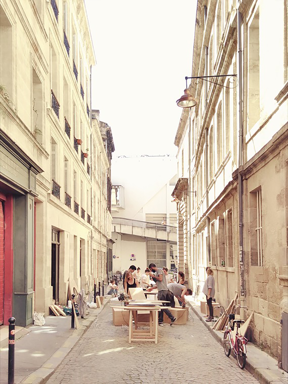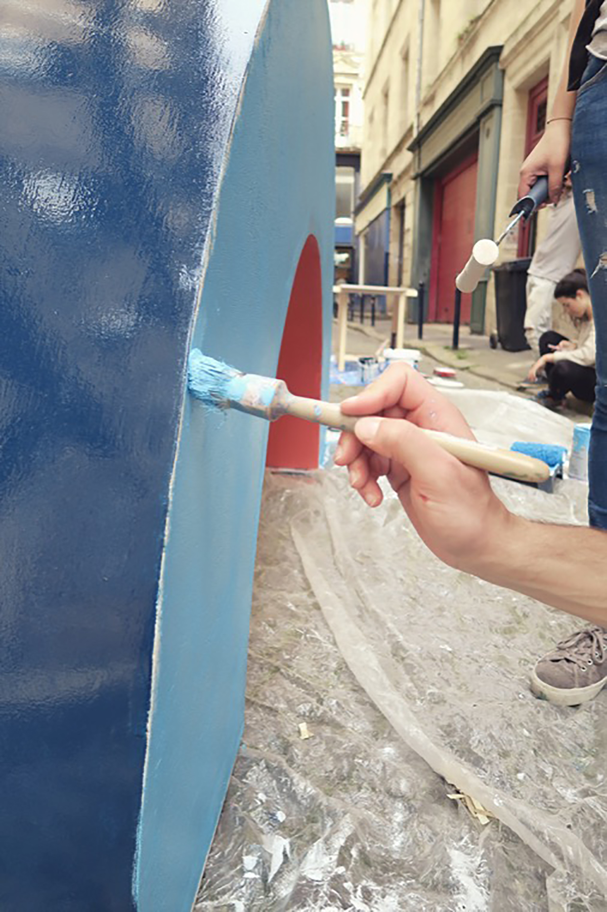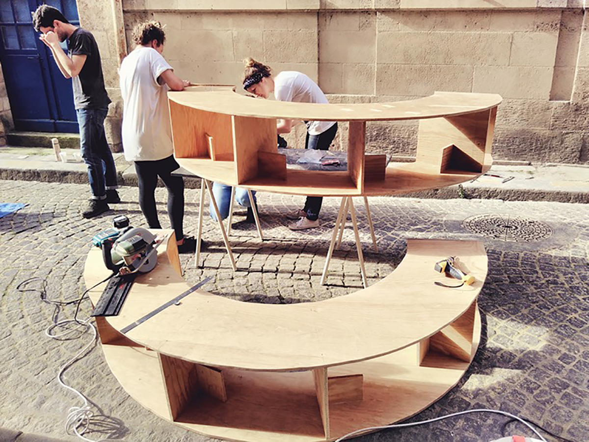 La fabrication des éléments a fait l’objet d’un chantier ouvert réalisé en pleine rue, face aux locaux de l’association organisatrice Bordeaux Rock. Le temps de construction imparti était très limité et ces ateliers sauvages ont permis de rendre les moments de mise en oeuvre dynamiques et joyeux.