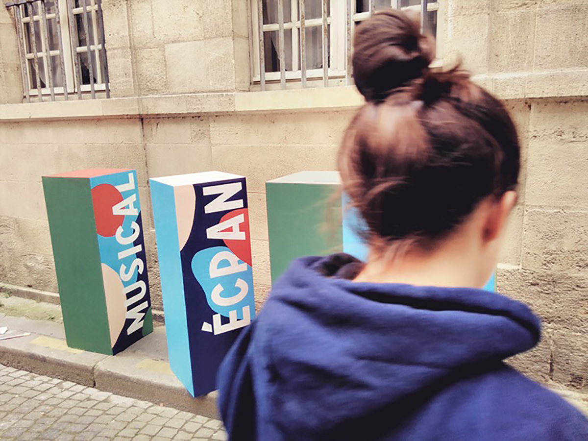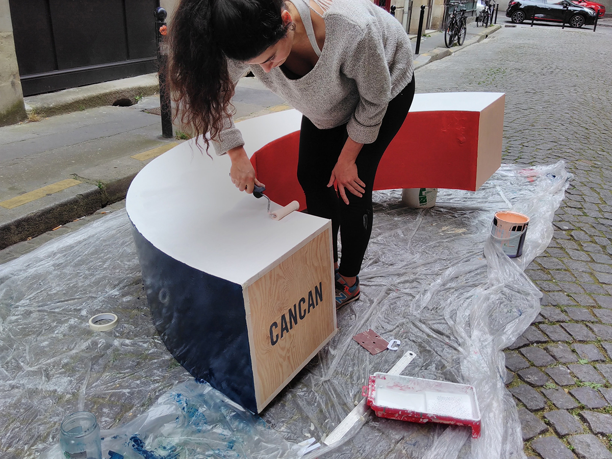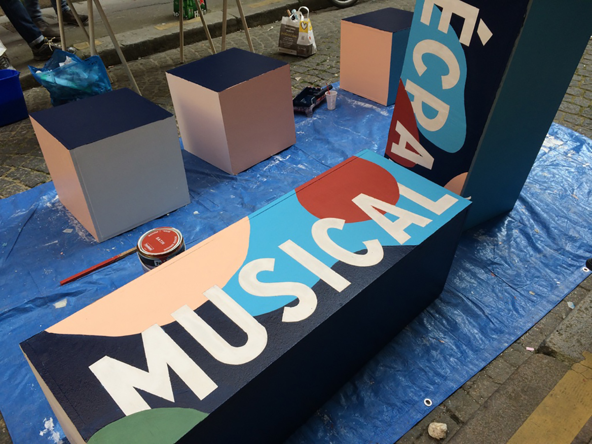 La fabrication des éléments a fait l’objet d’un chantier ouvert réalisé en pleine rue, face aux locaux de l’association organisatrice Bordeaux Rock. Le temps de construction imparti était très limité et ces ateliers sauvages ont permis de rendre les moments de mise en oeuvre dynamiques et joyeux.