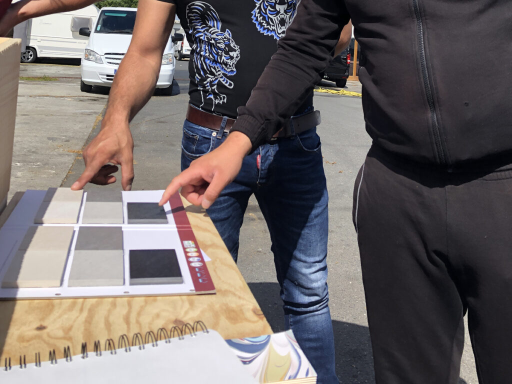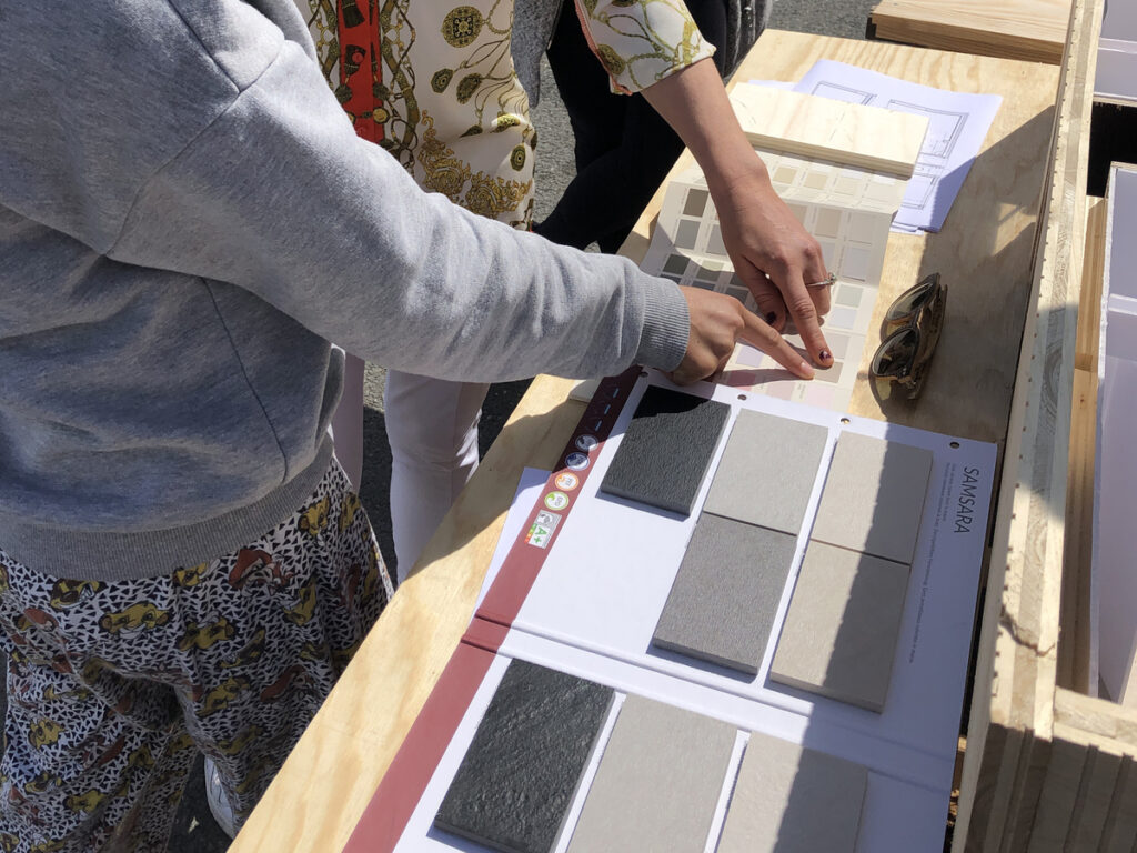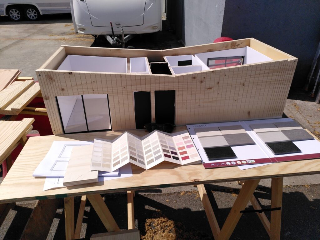 Le troisième atelier participatif in situ a permis, après une analyse de l’atelier précédent, de proposer deux solutions d’aménagement, synthèse des attentes de tous, habitants et gestionnaire, par le biais de documents graphiques, mais surtout par le biais de maquettes, de prototype de bardage, d’échantillons de revêtements, de nuanciers de peinture etc. Les solutions techniques ont été validées par le gestionnaire et surtout l’emplacement du local technique, et les choix sur les fournitures intérieures, jusqu’à la teinte de la peinture ont été fait, et ce presque unanimement !