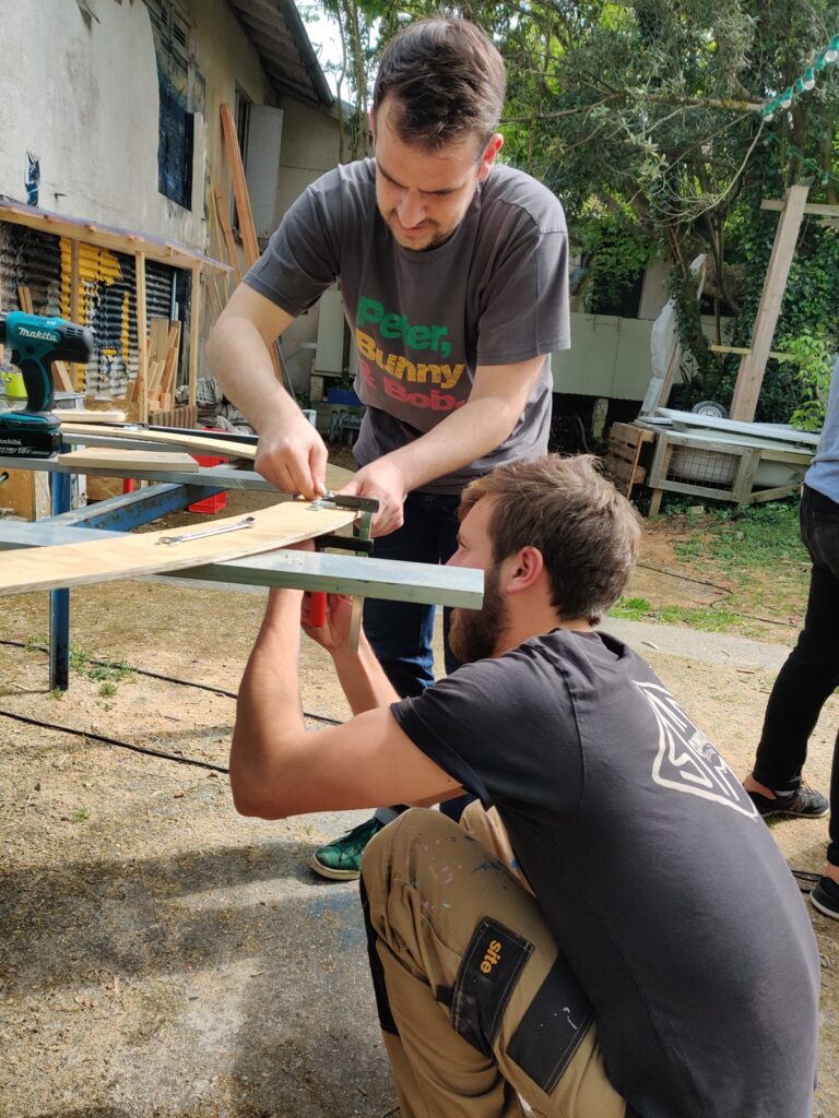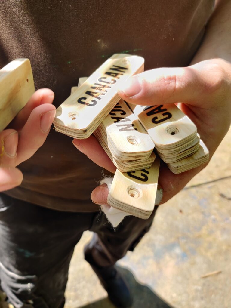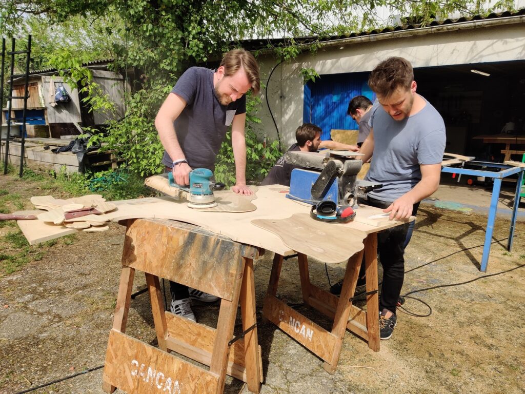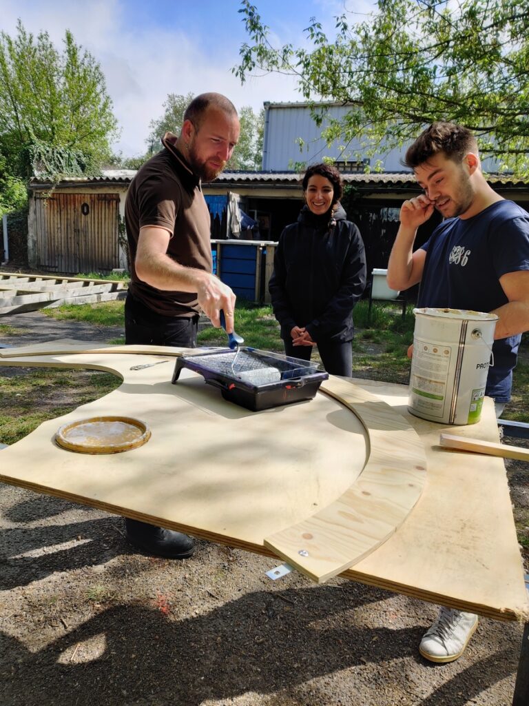 Un chantier main dans la main entre le commanditaire et CANCAN dans la bonne humeur ! Les volontaires ont pu s’essayer aux diffférentes machines et étapes de fabrications du projet. Tous les éléments bois sont issus des stocks CANCAN de réemploi. Cet ensemble a été pensé pour être utilisé de nouveau, on a hâte de le retrouver pour la fête des dix ans !